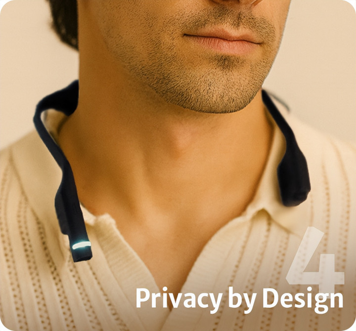 产品配备了1200万像素摄像头,位于靠近耳朵的模块上,最长可录制15分钟2K视频。值得一提的是,当用户把产品挂在脖子上切换到休息模式时,独特的外形设计能够自然地把相机向下倾斜,更好保护隐私。